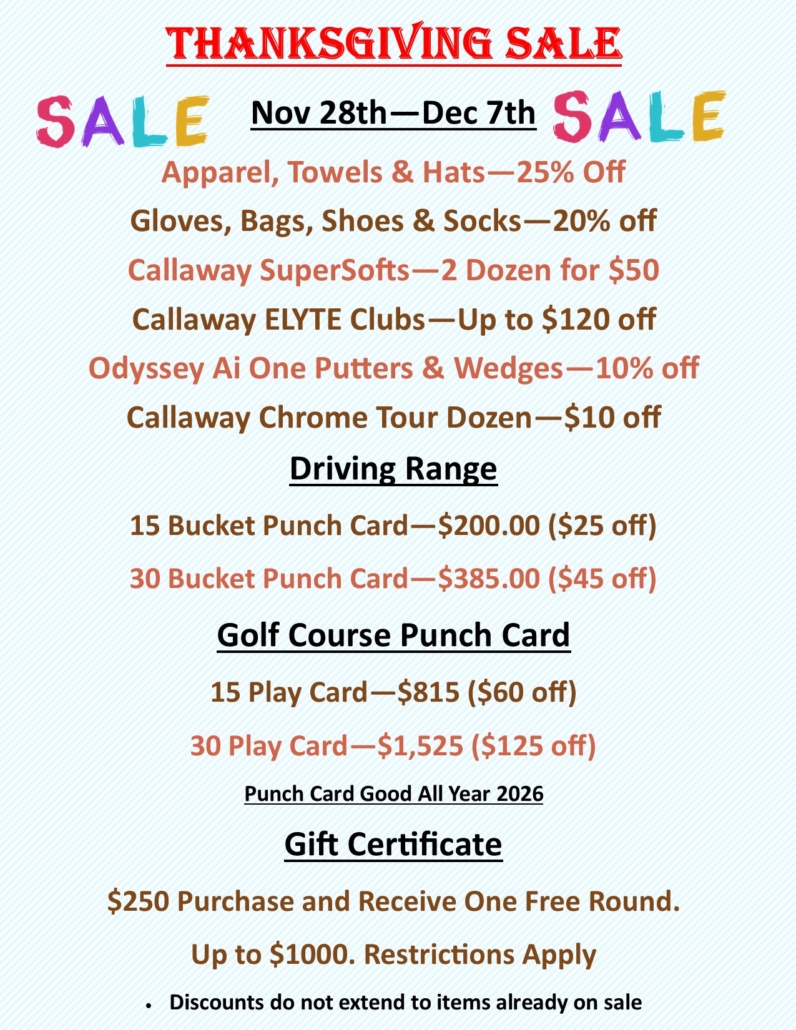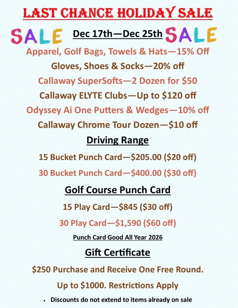 Monday Feb 2nd, First Tee time is 9 am or 30 min after we get above 32 degrees and the Freeze/Frost is off the course. My normal Monday Moring Groups will not start until then. Discounts available online!